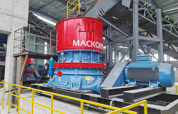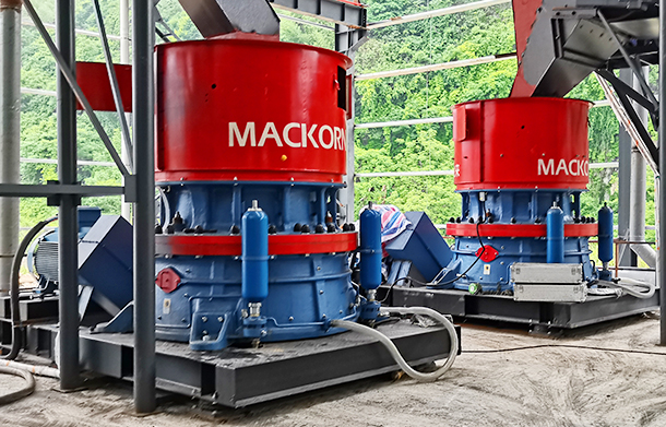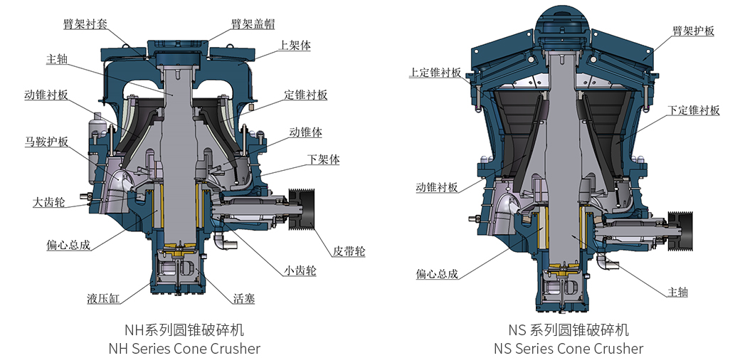 電機經(jīng)由大小齒輪帶動偏心套組件旋轉,由偏心套組件迫使主軸以懸掛點為中心,繞機器中心線旋擺運動。動錐的運行軌跡看起來是在破碎腔內來回擺動,同時緩慢的旋轉。物料被擺動的動錐擠壓破碎;